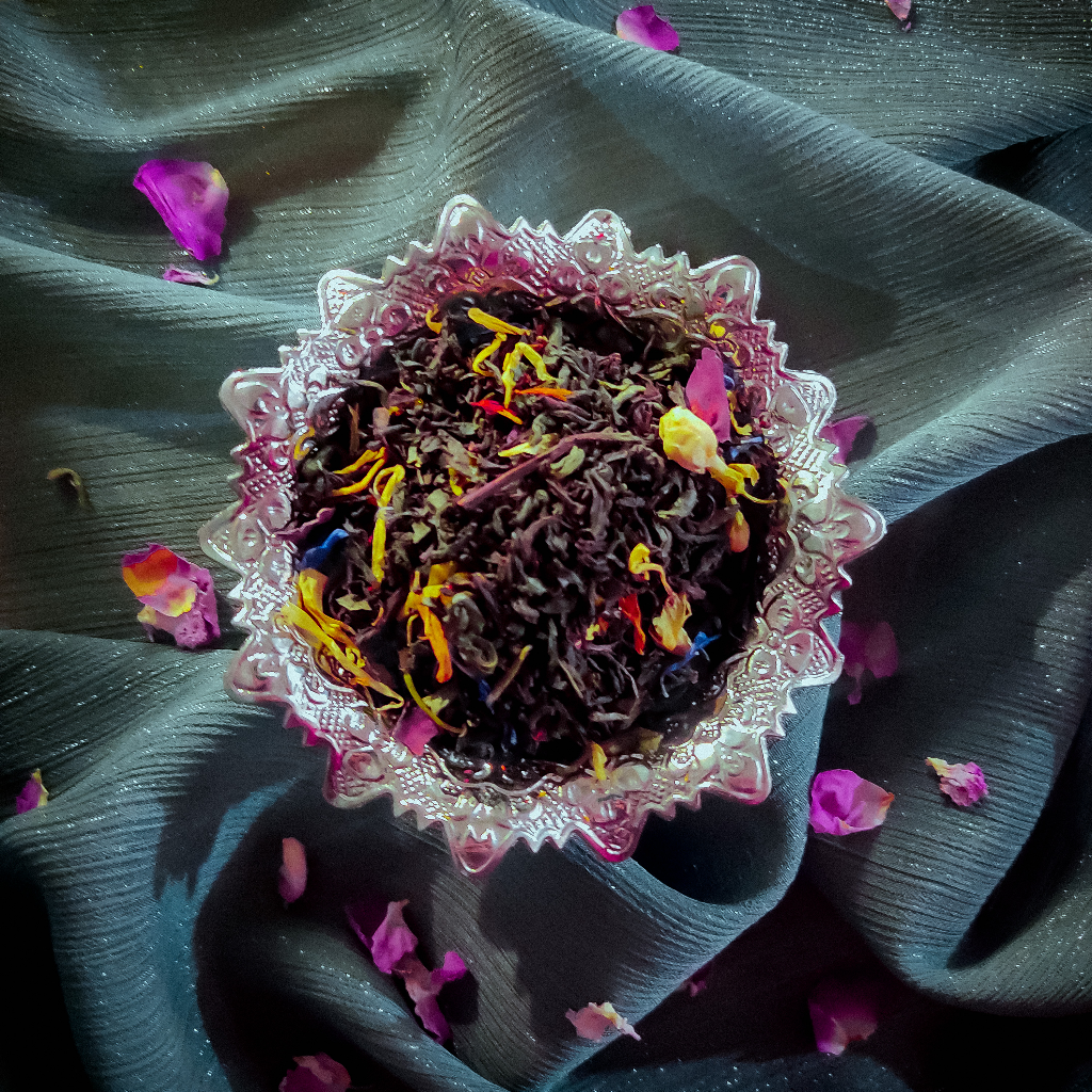چای سبز سرگل،تکه های میوه های استوایی،شکوفه یاس،گل گلرنگ،برگاموت
