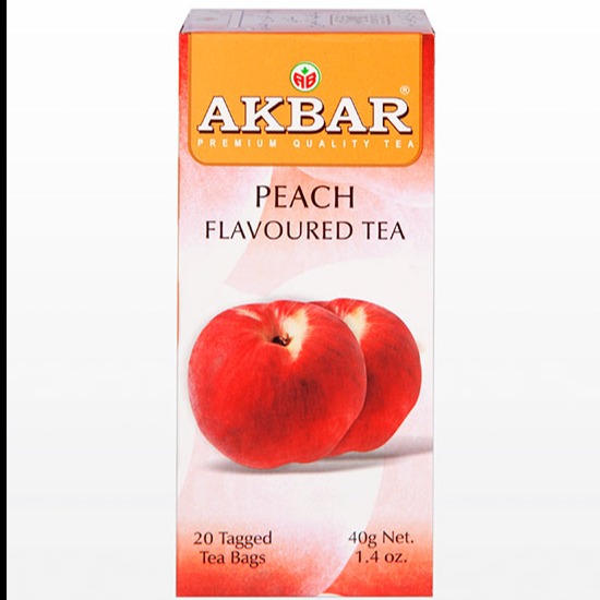 چای میوه ای برند خوشنام اکبر با طعم خاص و جذاب هلو تهیه شده از چای سیاه سیلان و تکه های هلو